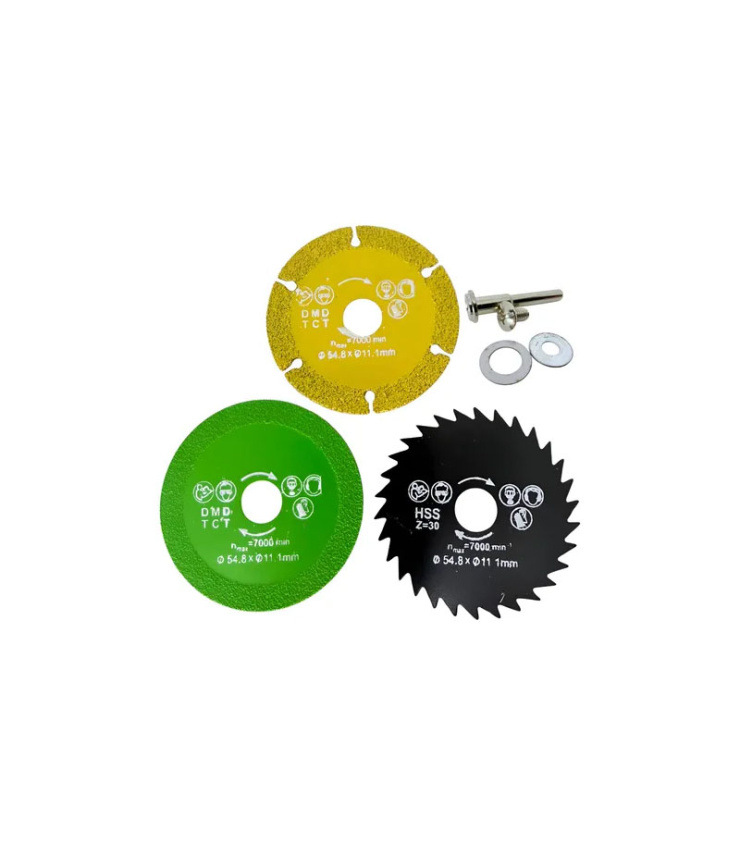 ست فرز تیغ برش شامل 3 تیغ برش مختلف و یک واسطه برای انواع مختلف برشکاری است.